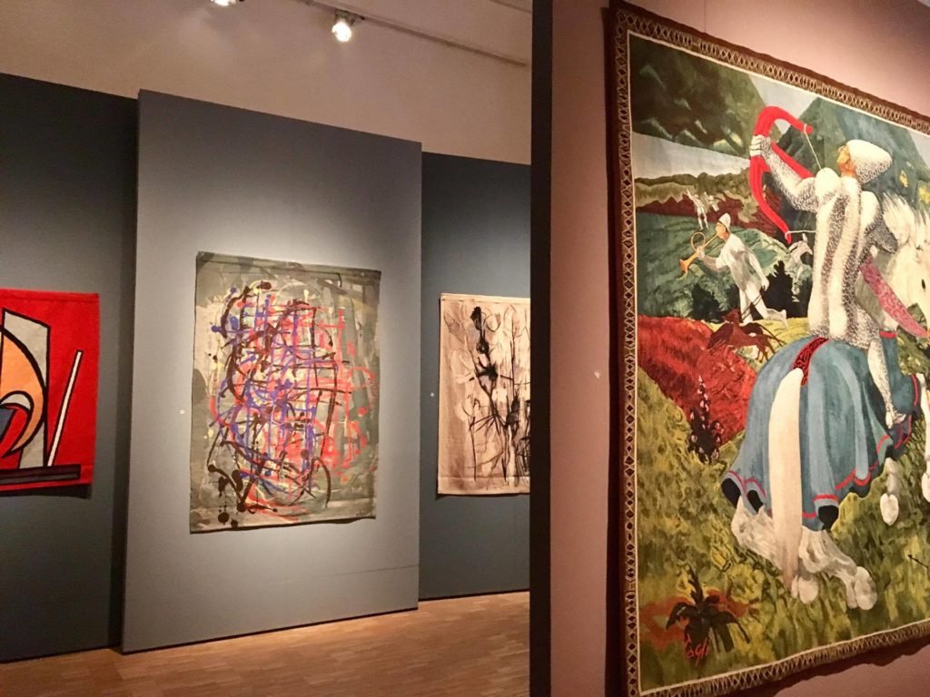 Ma il periodo di maggiore splendore lo si raggiunge negli anni ’60, cui è dedicata la terza sezione. Alla celebre Arazzeria Scassa, che traduce sul tessuto opere di Mario Sironi, Paul Klee, Corrado Cagli, Renzo Piano, si aggiunge l’Atelier di Arte Tessile Elio Palmisano, grande esperto di arte contemporanea, che lavora in sinergia con designer, architetti, pittori, spaziando dai grandi astrattisti a UgEttore o Nespolo a Sottsass, dando vita ad una delle più imponenti collezioni di tappeti e arazzi d’artista. Mentre la Sardegna, forte della sua tradizione artigianale, avvia produzioni originali mettendo all’opera ricamatrici come Niki Berlinguer che con ago e filo, attraverso la tecnica del piccolo punto, traduce i capolavori dei Maestri della pittura.