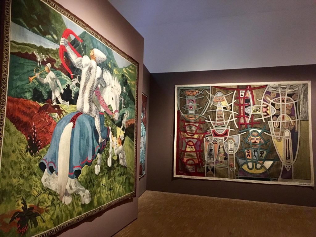 Nei saloni della Triennale sono esposti per la prima volta 107 tra arazzi e tappeti, grazie a prestiti provenienti da musei d’arte contemporanea di tutto il mondo e da collezioni private, firmati da 61 artisti (di cui 12 ancora viventi) che spaziano dai Futuristi italiani a Remo Salvadori, da Giacomo Balla a Lucio Fontana, da Mario Sironi a Renato Guttuso, da Fortunato Depero a Ugo Nespolo, da Ettore Sottsass a Gillo Dorfles, solo per citarne alcuni, e realizzati con abilità dalle principali manifatture italiane. Curata da Moshe Tabibnia e da Virginia Giuliano, la mostra è un complesso caleidoscopio di forme e colori che si dipana in un percorso espositivo che rivela per la prima volta l’interesse di questi artisti per un banco di prova visivamente e tecnicamente originale e stimolante. Dice Moshe Tabibnia: