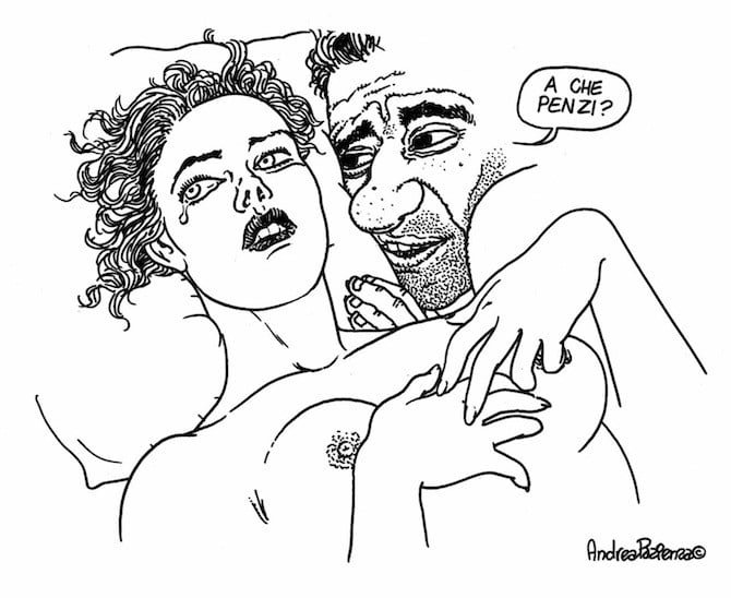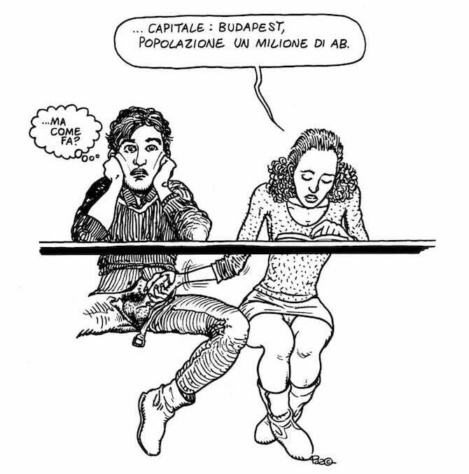 Una solitudine di chiusura che si palesa anche in un altro disegno, quello dei due compagni di banco; lei è intenta a studiare geografia mentre con la mano destra, sotto il banco, masturba l’amico che trasecola, sconvolto dalla capacità delle donne di fare più cose contemporaneamente. È tenerezza, è passione, è irriverenza allo stato puro. Oppure, semplicemente, come dice Manara: «È Pazienza, bellezza».