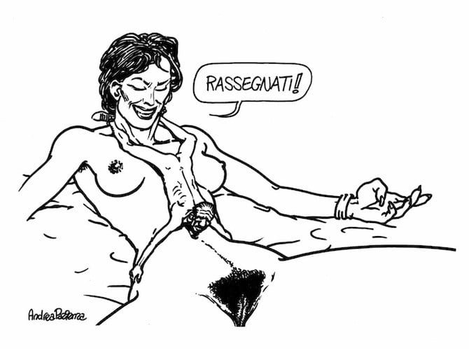 E passa ad analizzare un altro disegno, quello in cui una donna nuda, possente, si trova a gambe spalancate con il sesso ben in vista, mentre un omino piccino (spogliato, ma con ancora le scarpe) scivola su di lei tentando di resisterle, mentre la strada spianata verso le parti del godimento lo rendono minuscolo e ridicolo insieme. Lei lo sa, e lo guarda con un sorriso beffardo, consapevole del suo potere e dell’arma di seduzione su cui normalmente siede ogni giorno. C’è uno squilibrio tra i due, un rapporto di forza sbilanciato che vede un vincitore e un vinto sui fronti opposti di genere, come un gioco delle parti già stabilito.