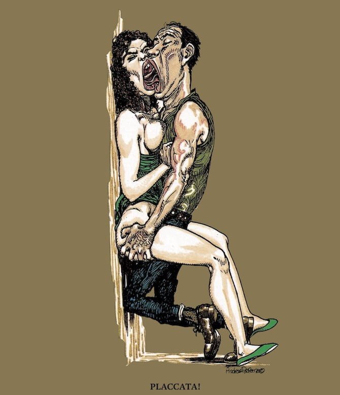 L’altro vede una ragazza schiacciata contro il muro, mentre l’amante la spinge con una sorta di furor incontrollabile e la scritta in basso ci viene incontro a caratteri maiuscoli urlando: «Placcata!». I due sono impermeabili l’uno all’altra, lui posseduto dalla cieca libidine, con la mano stretta ad agguantare il gluteo dell’amante mentre lei, inerte, poggia una mano sul suo petto nell’intenzione di tenerlo a distanza, senza tuttavia opporsi del tutto, nel tentativo, come dice Manara, di farlo venire in fretta così che tutto finisca. Le lingue sono aggrovigliate tra le bocche innaturalmente spalancate, in quello che più che un bacio sembra una lotta, mentre le gambe di lei quasi paiono ciondolare in un abbandono che sa di resa. Non c’è più asimmetria ma vera e propria incomunicabilità.