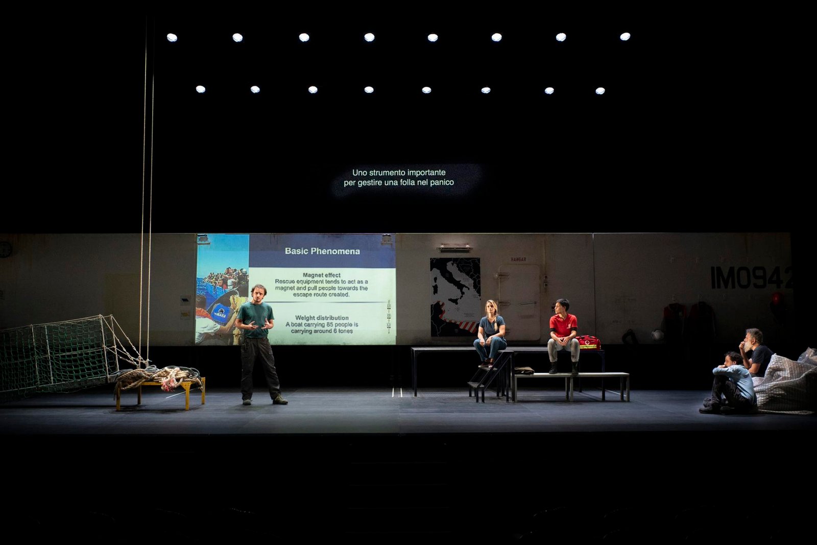 Da anni, a ondate, quella dei migranti del Mediterraneo è una delle principali notizie ai telegiornali. Naufragi, detenzioni, rimpatri, processi agli operatori umanitari. Quello che manca sempre è il fattore umano. Ed è a questa mancanza che cerca di rimediare A place of safety. Lo spettacolo porta infatti sul palco non attori professionisti, o non solo, ma persone che in prima linea si impegnano, con ruoli diversi, nel soccorso in mare. Incontriamo allora Flavio Catalano, ex ufficiale di Marina che ora è volontario sulla nave Life Support di Emergency; Miguel Duarte, membro dell’equipaggio di Iuventa e Sea-Watch e attivista di HuBB – Humans Before Borders, interpretato nella replica all’Auditorium Melotti di Rovereto da un attore in quanto impegnato altrove; Giorgia Linardi, portavoce in Italia di Sea-Watch, anche lei assente fisicamente e le cui parole sono state riportate da un’attrice; Floriana Pati, infermiera che dopo una prima esperienza in ospedale ha deciso di portare la propria professionalità sulla nave Life Support; José Ricardo Peña, elettricista texano di origini messicane che lavora sulla Sea-Watch. C’è anche Nicola Borghesi, regista, attore e fondatore insieme a Enrico Baraldi della compagnia Kepler-452, che interviene in scena e risulta quasi un intruso nel caleidoscopio di umanità e professioni che si intrecciano.