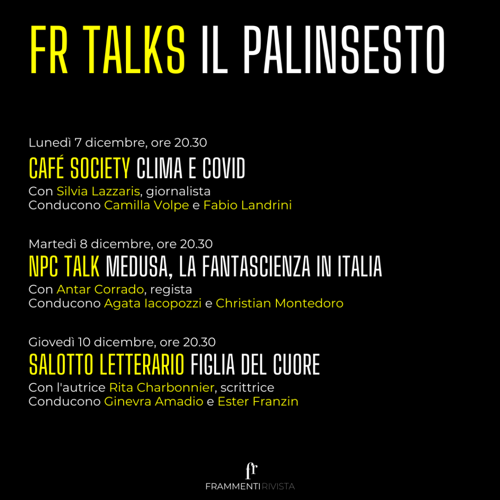 Nuova settimana, nuovi talk targati Frammenti Rivista! Si comincia domani, lunedì 7 dicembre (ore 20.30), con una nuova puntata di Café Society: l’ospite di Camilla Volpe e Fabio Landrini questa settimana è la giornalista Silvia Lazzaris, con cui discuteremo di clima e Covid. Martedì 8 dicembre (ore 20.30) tocca a NPC Talk: Agata Iacopozzi e Christian Montedoro dialogheranno con il regista Antar Corrado, autore del corto di fantascienza “Medusa”. Chiude la settimana il Salotto Letterario: giovedì 10 dicembre (ore 20.30) l’ospite di Ginevra Amadio e Ester Franzin è la scrittrice Rita Charbonnier, autrice del romanzo “Figlia del cuore”.