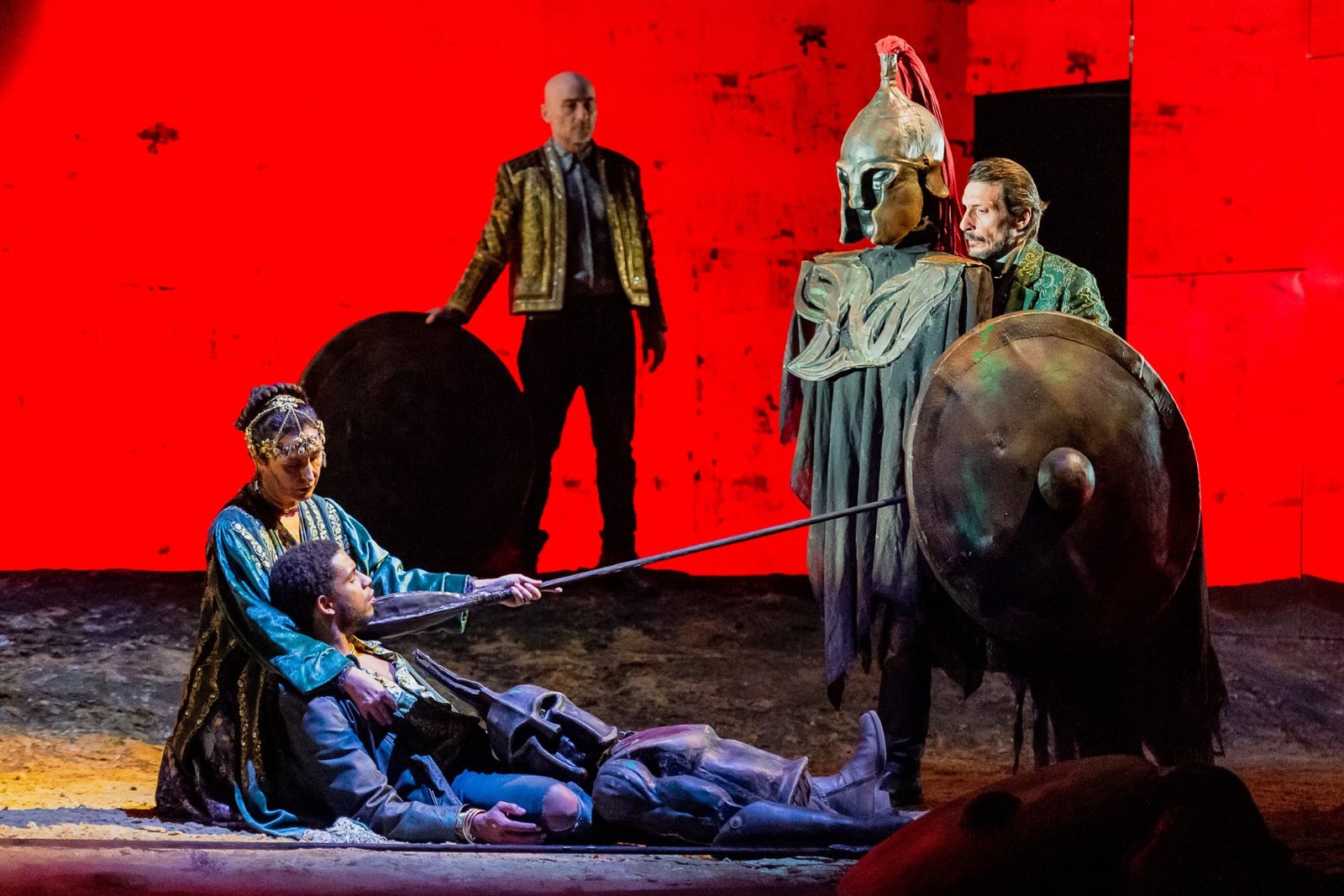 Una nota di merito va senza dubbio alla scenografia, opera di Massimo Troncanetti, e ai costumi e oggetti di scena, curati da Francesco Esposito, Alberto Favretto, Marta Montevecchi e Raquel Silva. La scena, inizialmente spoglia e buia, si rivela all’inizio della messa in scena degli eventi della guerra di Troia. Pur rimanendo essenziale, gioca con il controluce e i colori del fondale, ispirato forse ai fondi dorati e sporchi di alcune delle opere più celebri del pittore tedesco Anselm Kiefer. Luci e colori vanno dunque ad animare quella che è a tutti gli effetti un’arena, entro la quale gli dèi si scontrano, sia come loro stessi che nelle vesti dei propri eroi, rivelando la propria natura disinteressata e crudele, capace di distinguere il bene dal male ma indifferente di fronte alla scelta e alla sofferenza provocata.