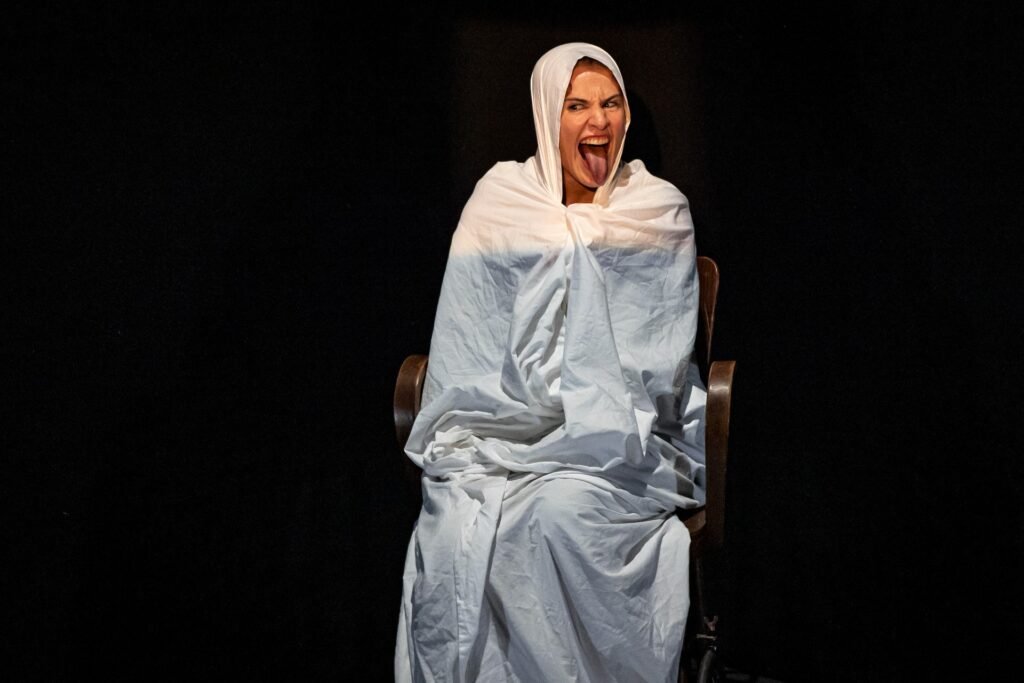 Da quando inizia lo spettacolo, allo spettatore è chiaro un immaginario ben specifico: una donna avvolta in un lenzuolo bianco è seduta su una sedia con ruote, dei suoni ospedalieri fanno subito intuire dove si trova.